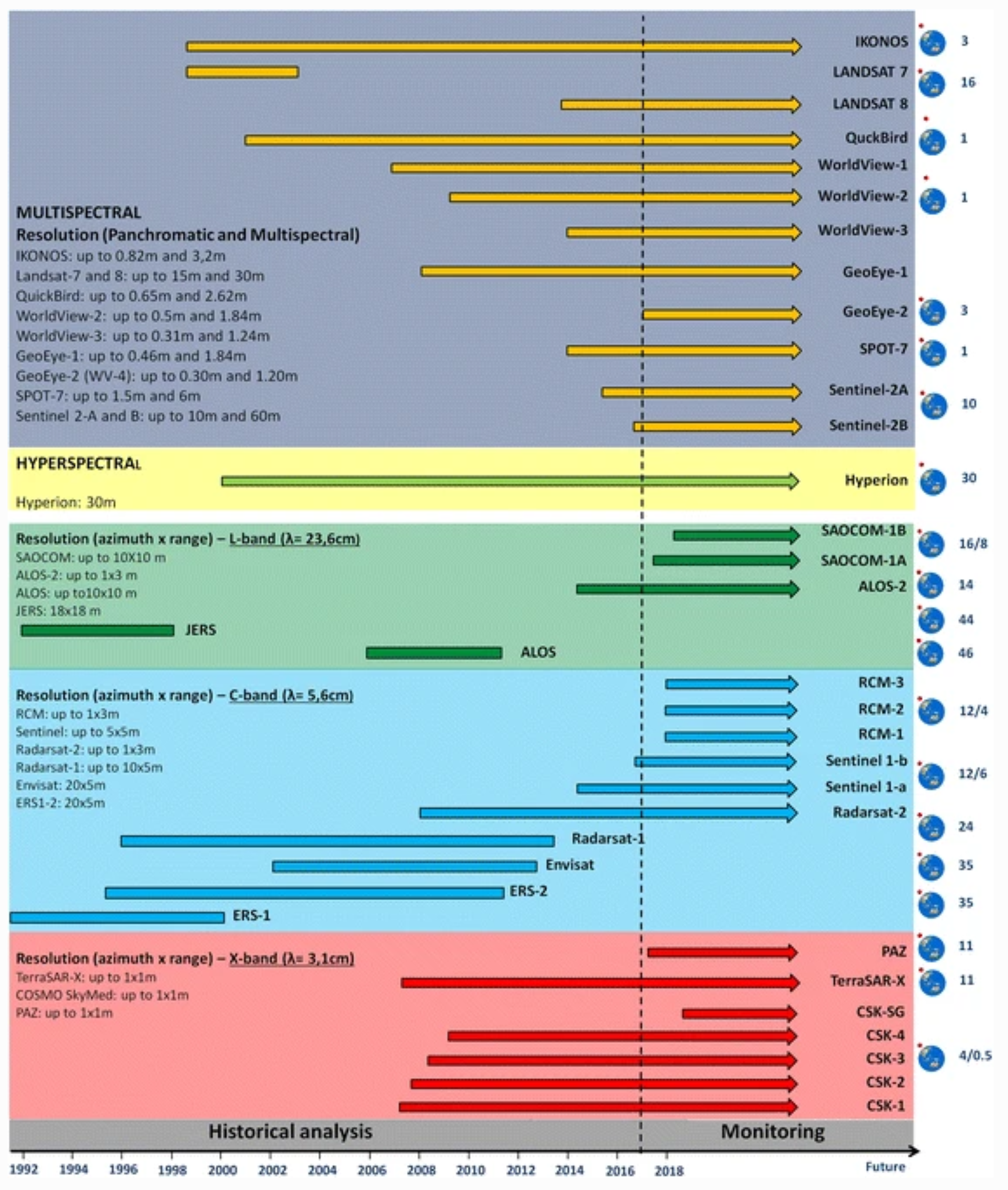 Fig. 1: Operating optical and SAR satellites for earth observation. The numbers on the right of the figure report the revisting time of each satellite at the equator. (Casagli et al. 2017, https://doi.org/10.1186/s40677-017-0073-1