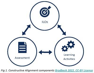 Your colleague is very thankful for your help. Let’s see if you can help him to fit these ideas into a larger framework that he can reapply over and over again by using the concept of “Constructive Alignment”. This concept is used to align desired learning outcomes with learning activities, teaching activities and assessment (Fig. 1). For an overview and as accompanying material you can work with Aligning Assessments with Learning Outcomes along with this course. This is optional, of course.